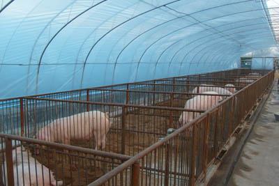 4、雙層塑料膜,霜在上層,漏下時卻用下層接住,不至于到處滴水。另外加了一層膜,還會增加保溫性能,對于不便于使用草簾的豬舍可起到一勞永逸的作用。里層塑料布因為舍內(nèi)風(fēng)小,不需要太結(jié)實,用鐵管或生產(chǎn)竹竿做支架都可以,所以成本也不高。   如果豬舍沒有了潮氣,也就不需要過多的通風(fēng);因為塑料大棚的空間足夠大,一般不會出現(xiàn)空氣不足現(xiàn)象。
